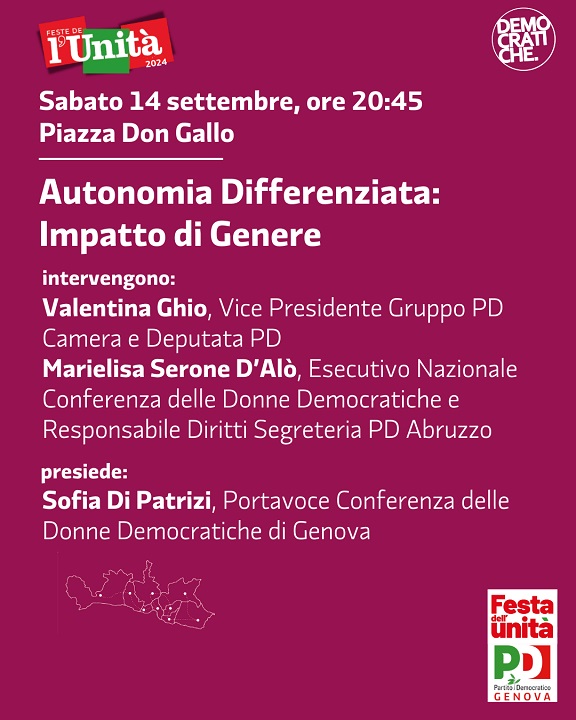 Venerdì 13 settembre alle ore 20.45, in piazza Don Gallo, La Festa dell’Unità delle donne democratiche, che mette l’accento su Il tempo della cura: politiche pubbliche e ruolo associazionismo per un welfare inclusivo.