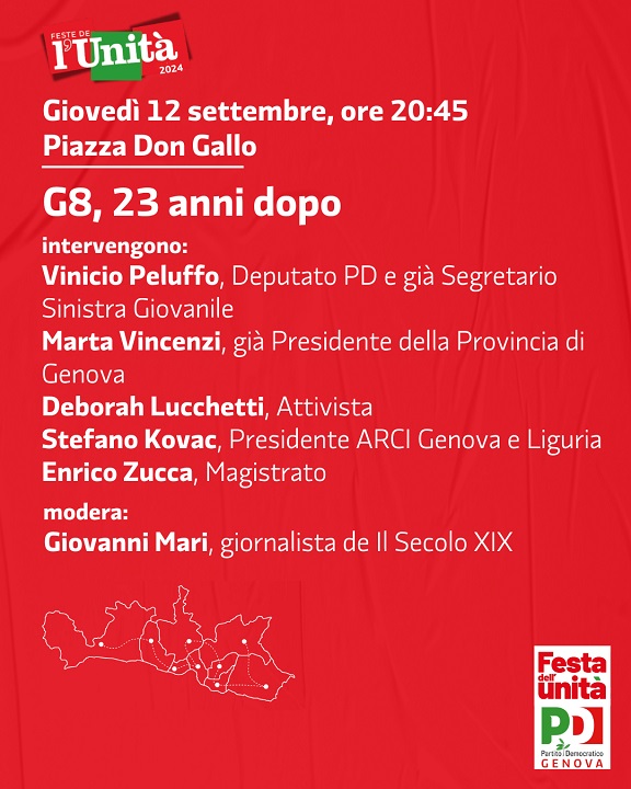 Giovedì 12 settembre alle ore 20.45 in piazza Don Gallo, per la Festa dell’Unità, Vinicio Peluffo, deputato PD e già segretario Sinistra giovanile; Marta Vincenzi, già presidente della Provincia di Genova; l’attivista Deborah Lucchetti; il presidente di Arci Genova e Liguria Stefano Kovac e il magistrato Enrico Zucca, intervengono su G8 ventitré anni dopo.